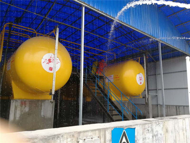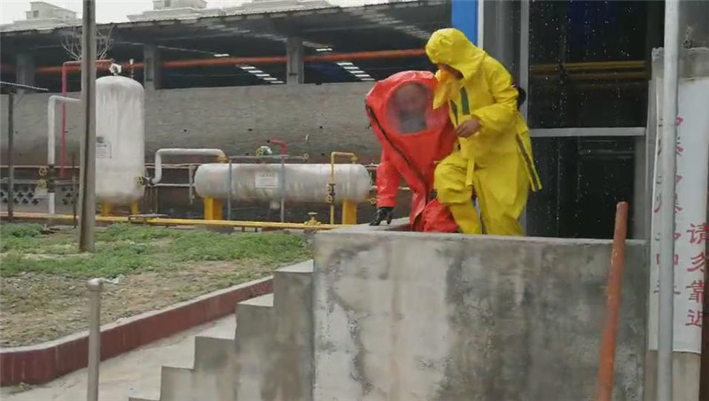 6月21日上午10時,隨著焦作市地豐肥業(yè)有限公司上空警報器拉響,發(fā)現(xiàn)“險情”的氨站工作人員周立榮、王馬對手提防毒面具趕到現(xiàn)場進(jìn)行檢查,在2號氨罐聞到氨味后,迅速佩戴防毒面具走進(jìn)巡查,發(fā)現(xiàn)2號氨罐頂部出口有大量液氨泄漏,立即判斷為氨罐出口閥閥體破裂造成液氨泄漏,趕緊向班長陳新政報告,氨站操作人員迅速打開安全應(yīng)急水幕噴淋,由此拉開了公司液氨泄漏應(yīng)急演練的序幕。